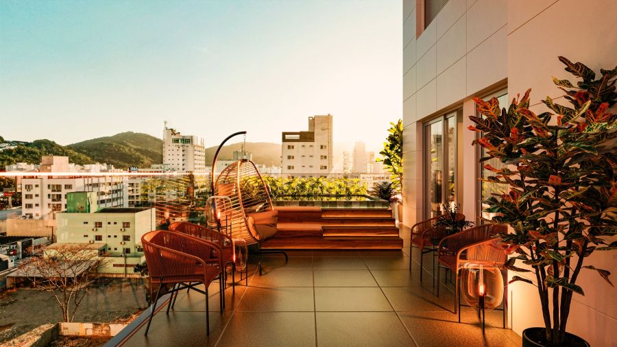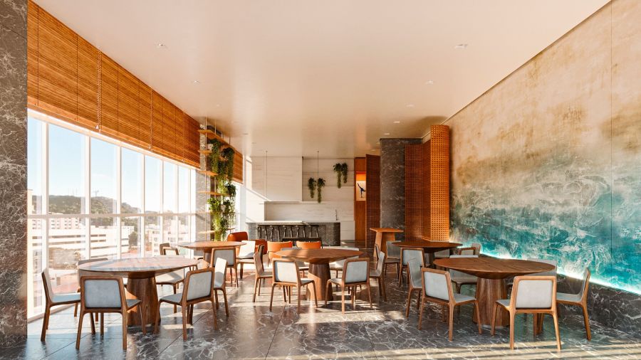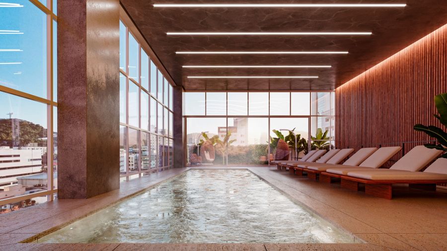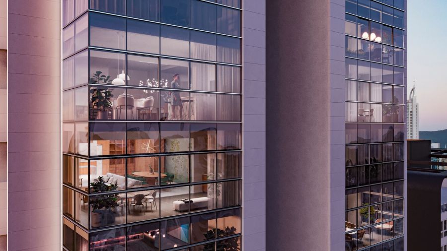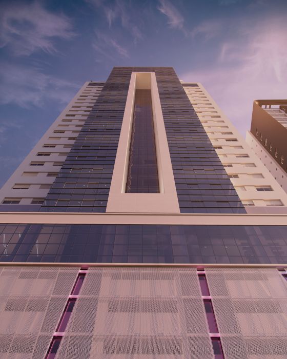 Projeto moderno com fachada em pele de vidro, acabamentos contemporâneos e infraestrutura completa, incluindo elevador panorâmico.