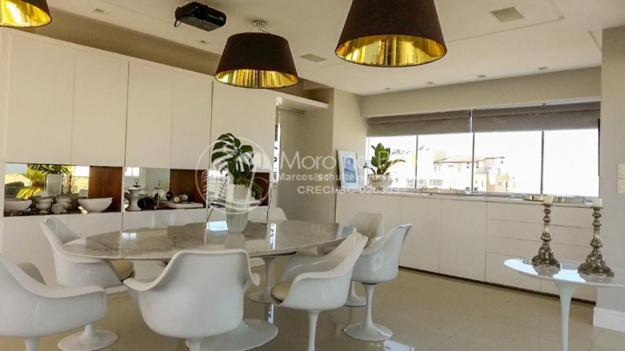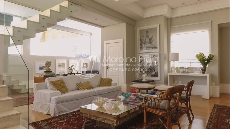 São 4 amplas suítes com piso em madeira e áreas sociais com porcelanato, todos os ambientes finamente decorados, alto padrão que oferece até tapetes persas certificados, móveis de marca conceituada e muitos artigos de luxo e elegância. Amplo living integrado em 3 ambientes, cozinha e copa com mesa para 12 pessoas. Banheiro social, área de serviço, área externa com piscina e cascata, churrasqueira, jardim e deck.